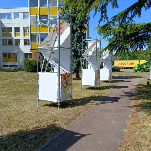 Pour cet événement qui s'est déroulé le Jeudi 2 juin, ce sont 5 totems qui ont été érigés et habillés intelligemment pour rappeler l'univers de l'imprimerie. Nos échafaudages ont permis ici une mise en lumière originale du parcours de cette entreprise centenaire.